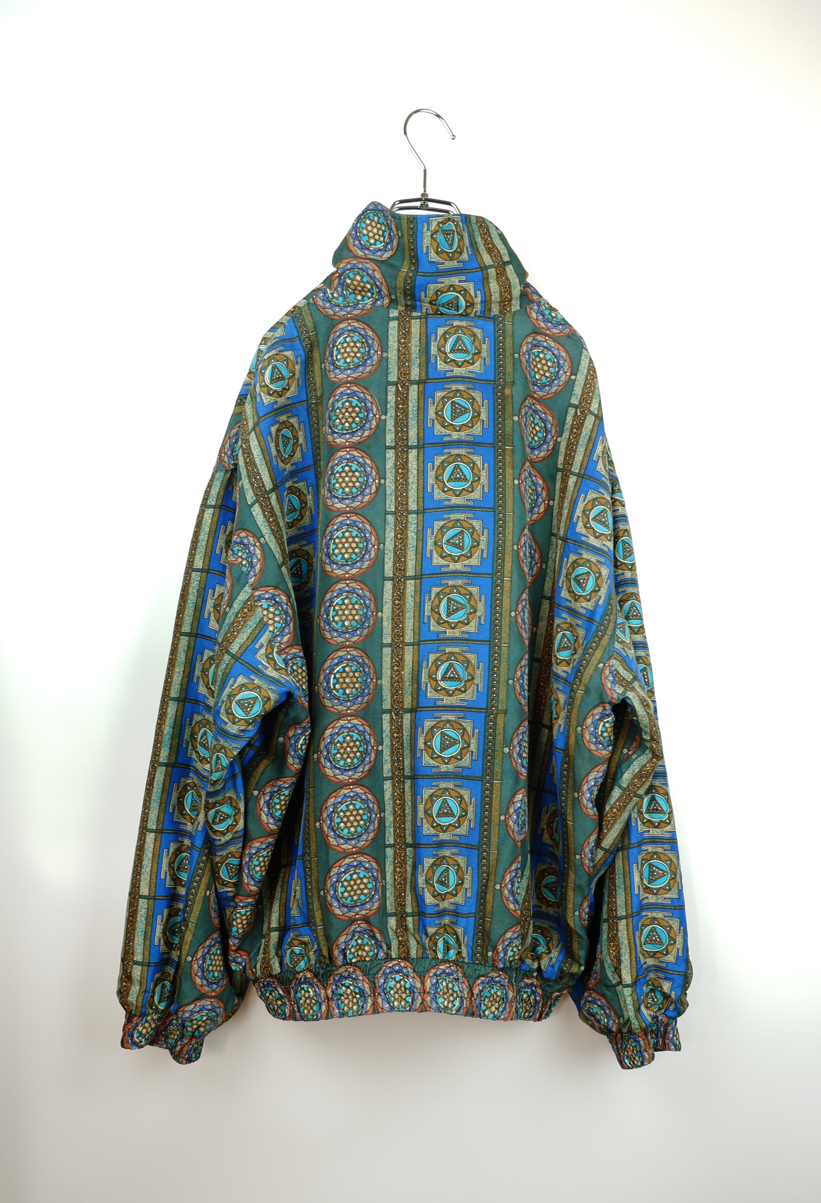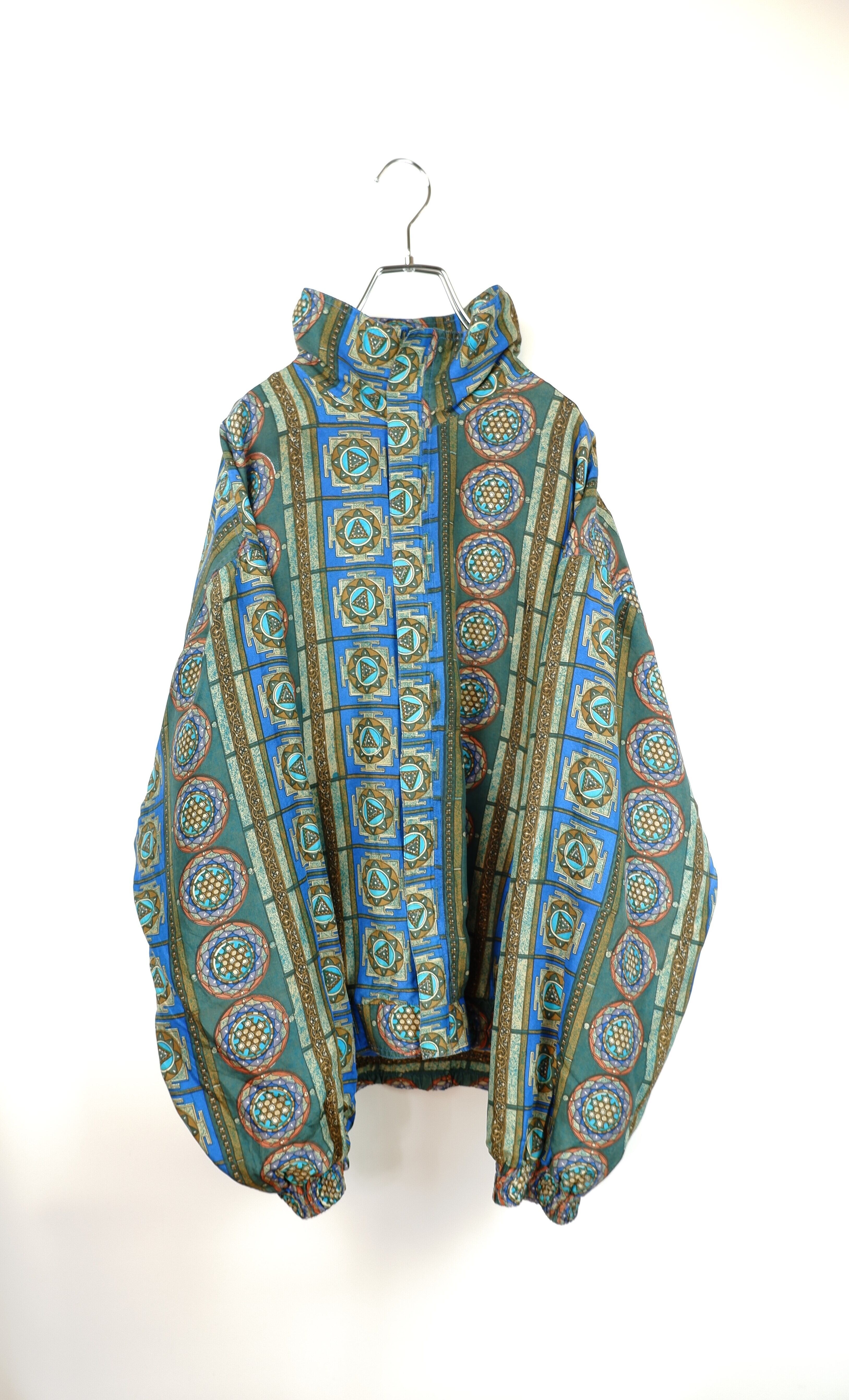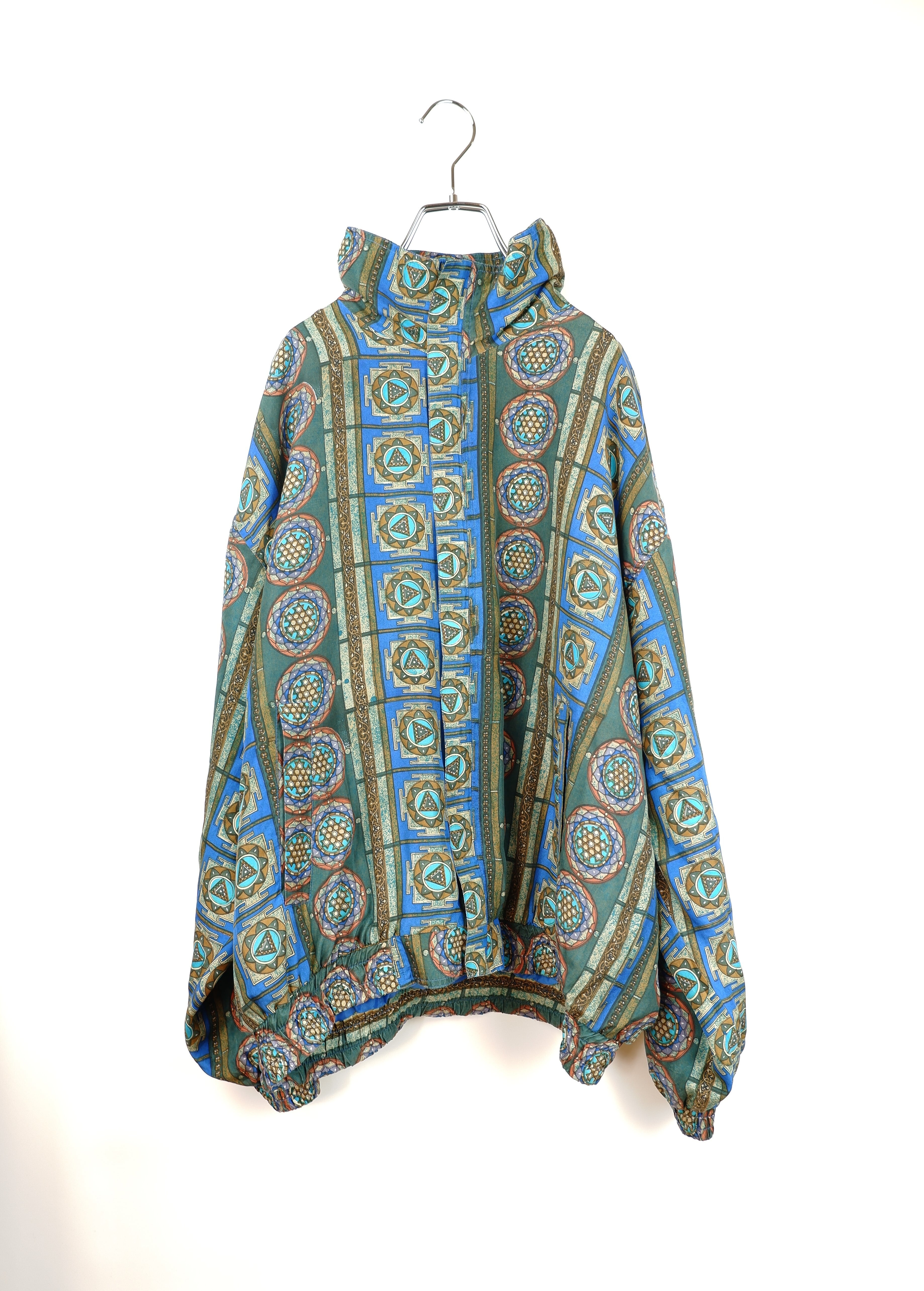 コメント:やや光沢感のある滑らかな生地感のシルク100%の特徴的なプリント総柄ブルゾンです。薄く軽めな生地感です。