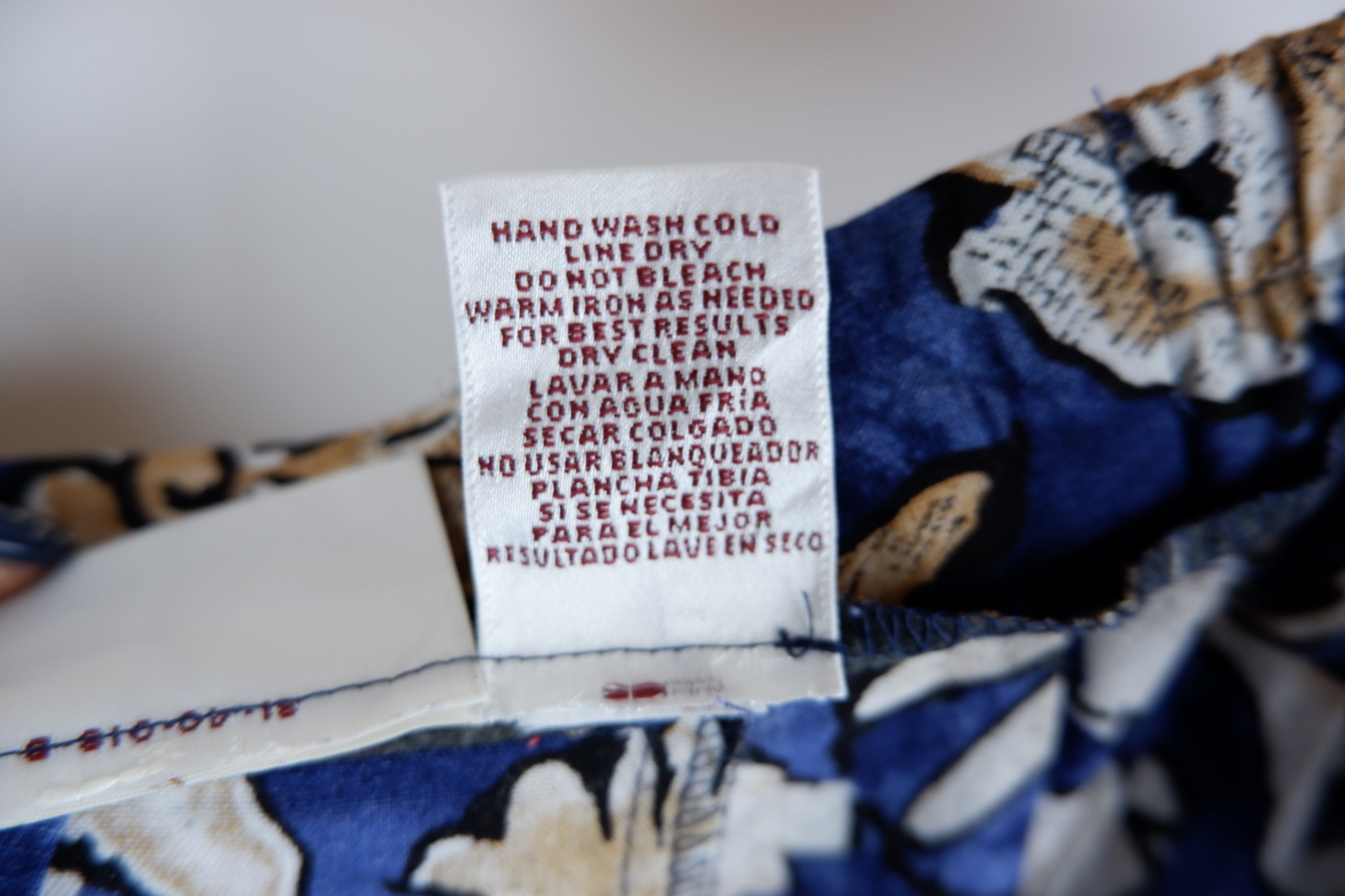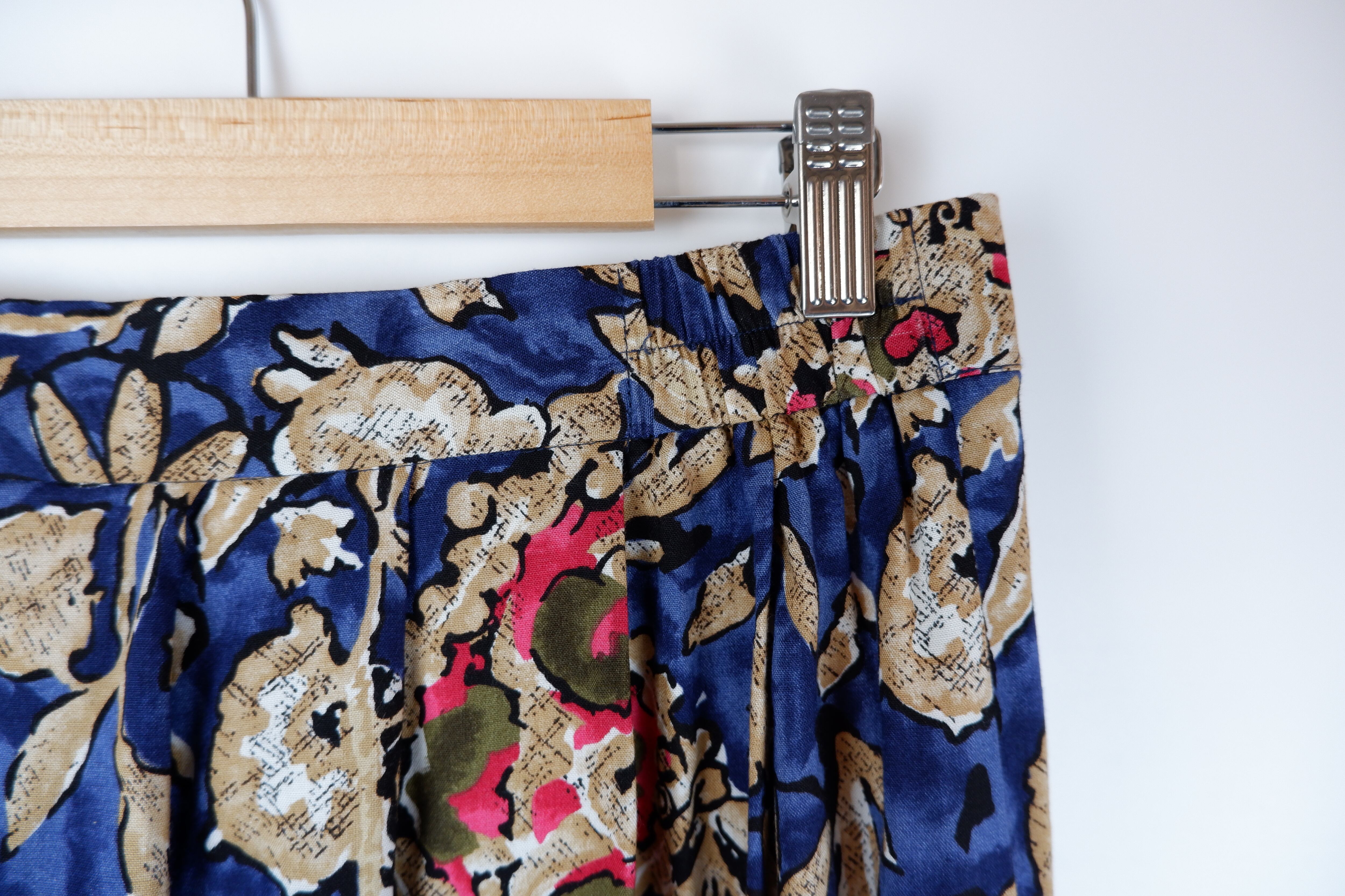レーヨン100%で滑らかな生地感。ウエストはくるみボタンで留める仕様です。