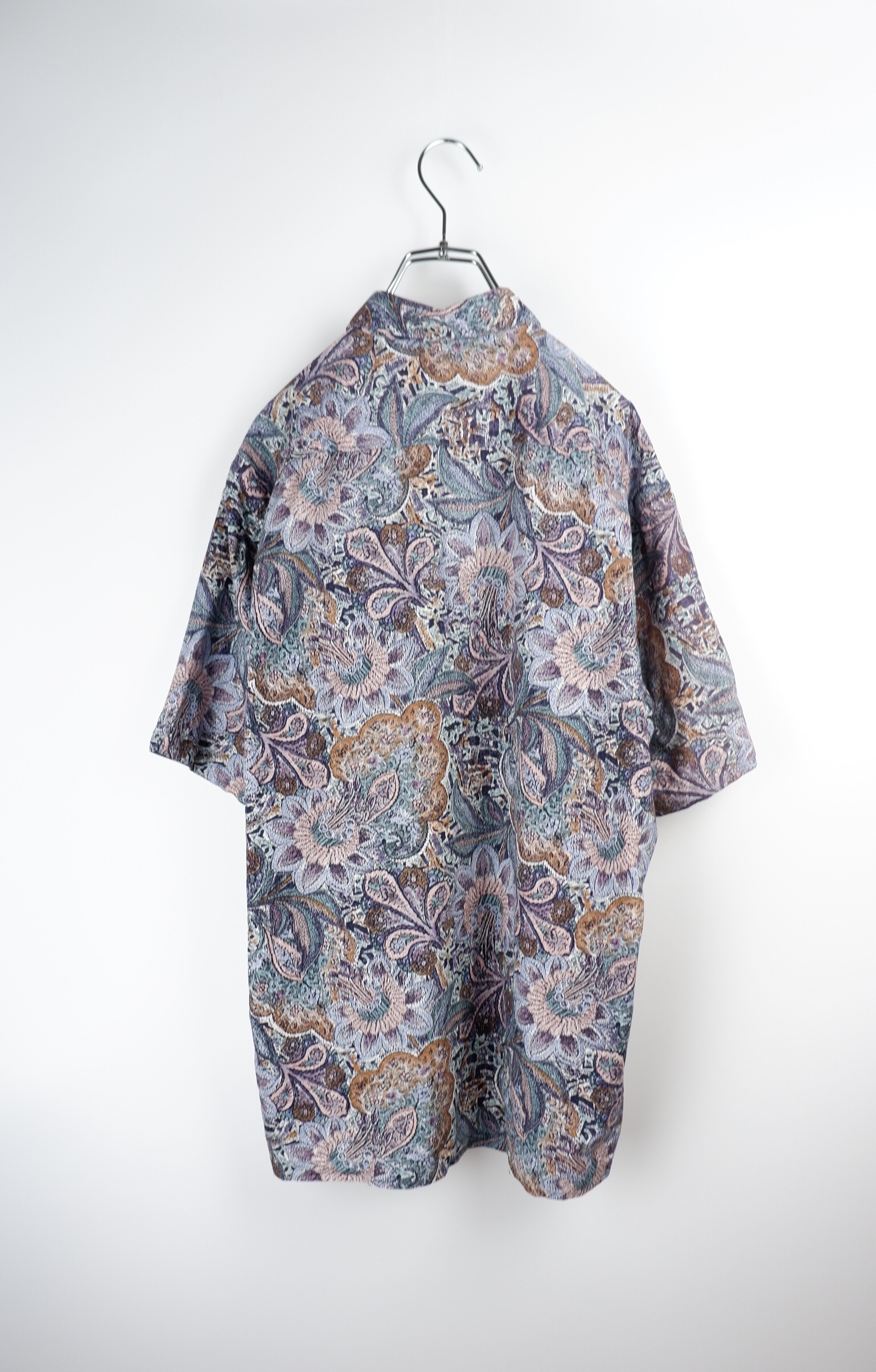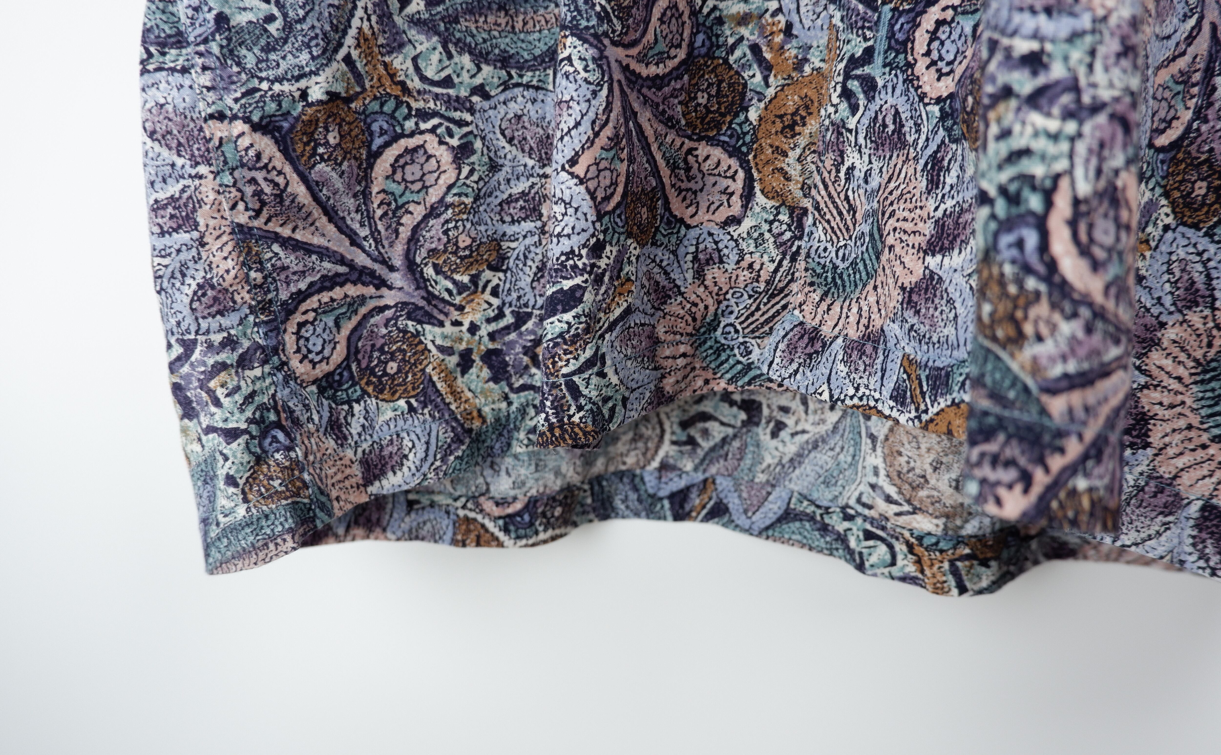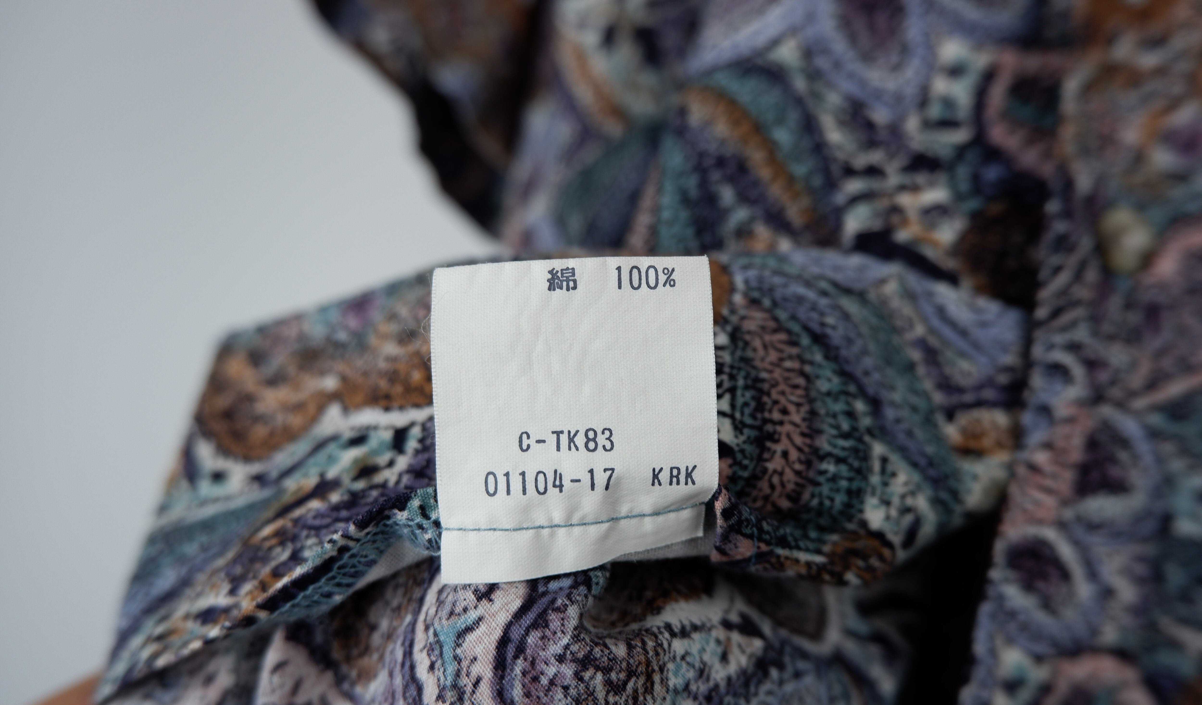 コメント:綿100%のしっかりとした生地感で個性的なプリントが特徴の総柄シャツです。