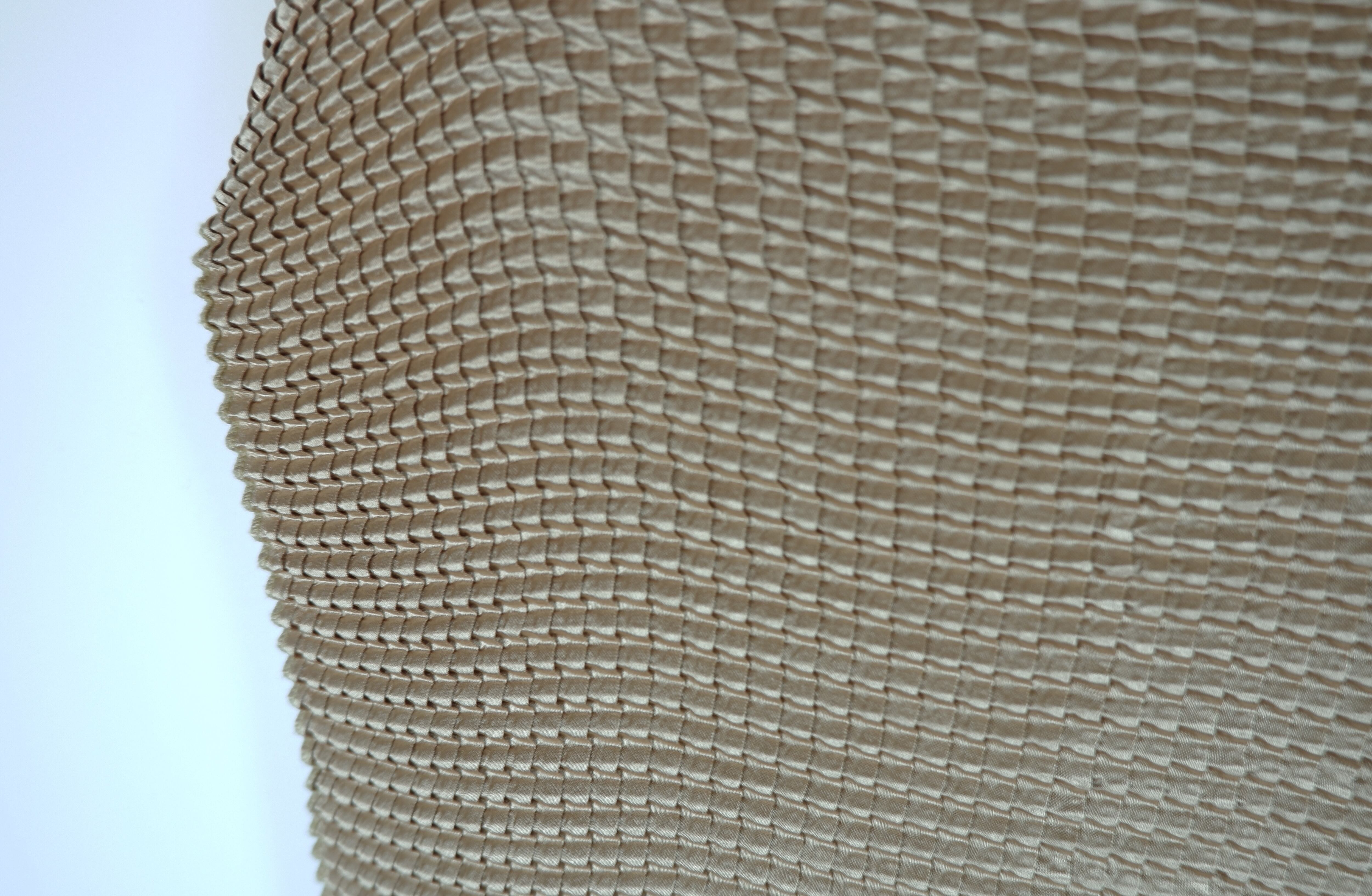 コメント:光沢感のあるゴールドの生地に、プリーツ加工を施したモックネックプルオーバーです。伸縮性があり着心地もよく、品の良い光沢感でコーディネートに使いやすい1着です。