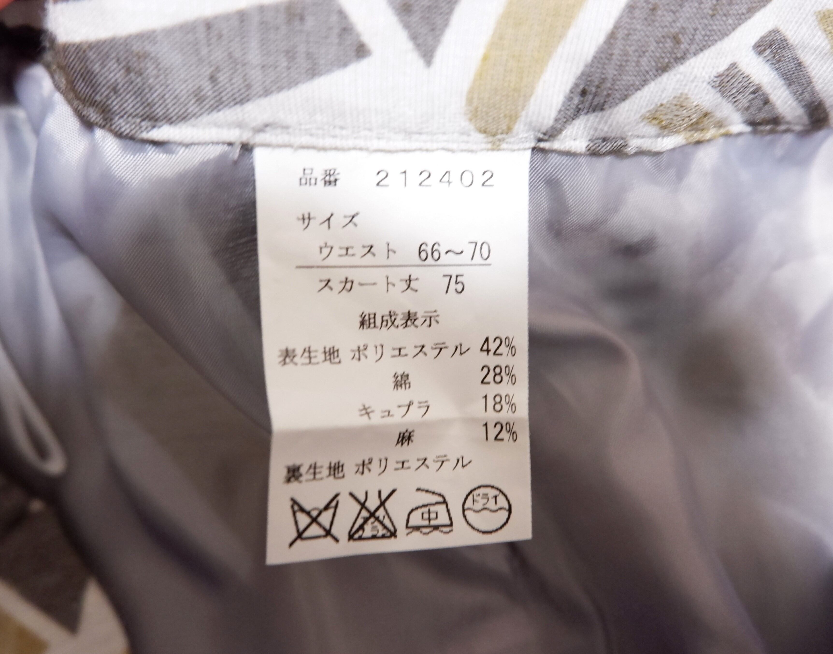 コメント:涼し気な色遣いと柄、やや透け感のある軽い素材の台形スカート。